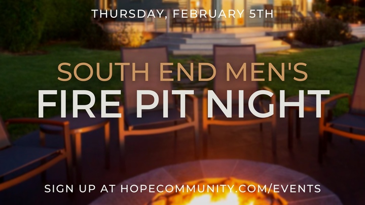 If you’re looking to connect with other guys at our South End site, we’d love for you to join us for our Men’s Fire Pit Night on Thursday evening, February 5th, from 8:00-9:30-ish. When you register, you will be randomly placed in a group of 8-12 men from Hope South End. From there, you’ll be invited to a host’s home to hangout with other South End guys. Your host will contact you the week before and let you know what you can bring to chip in for the group (firewood, s’mores stuff, drinks, etc.) This is a great way to meet other men from our South End congregation in a more relaxed setting. We hope you’ll join us!